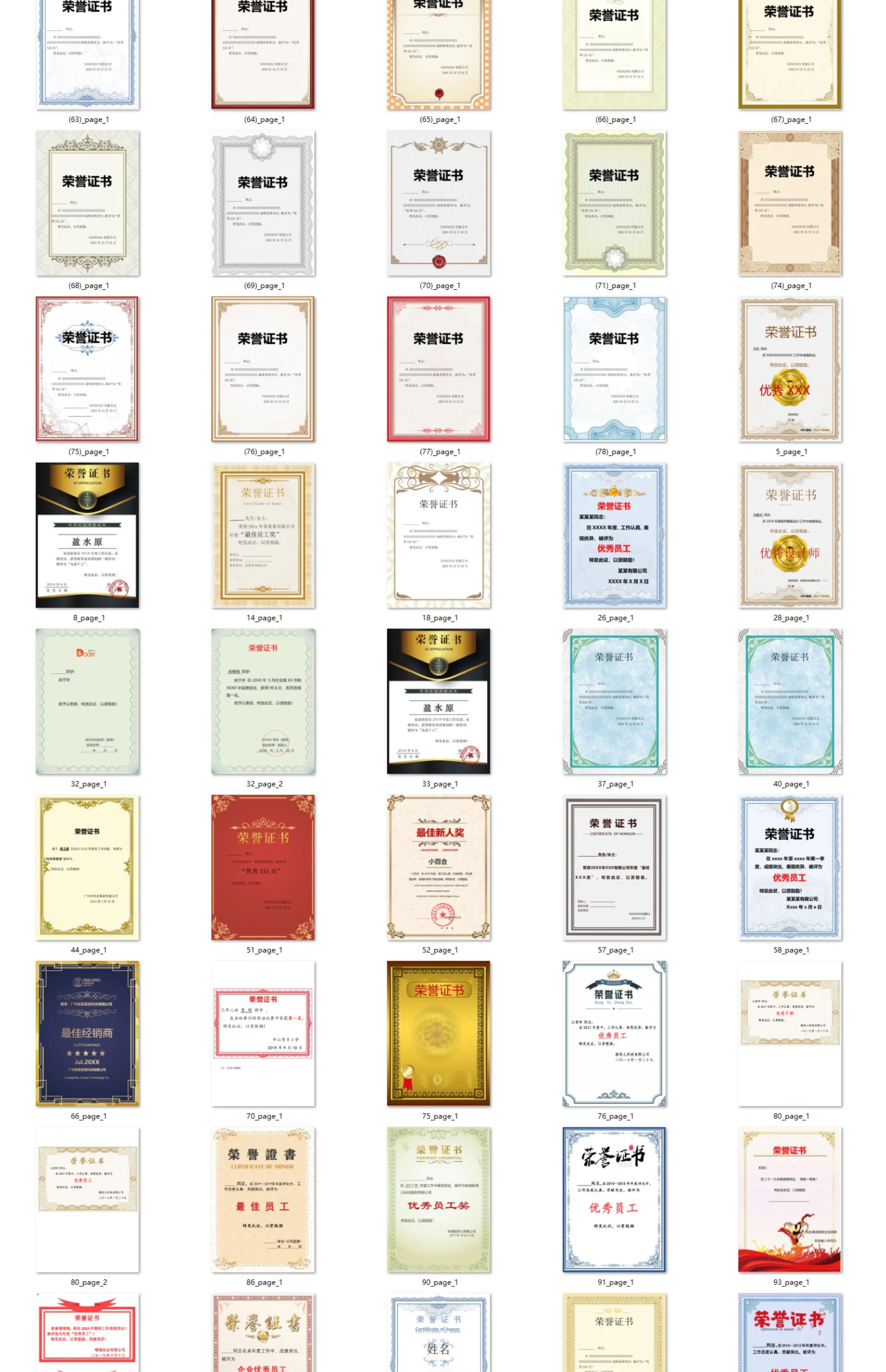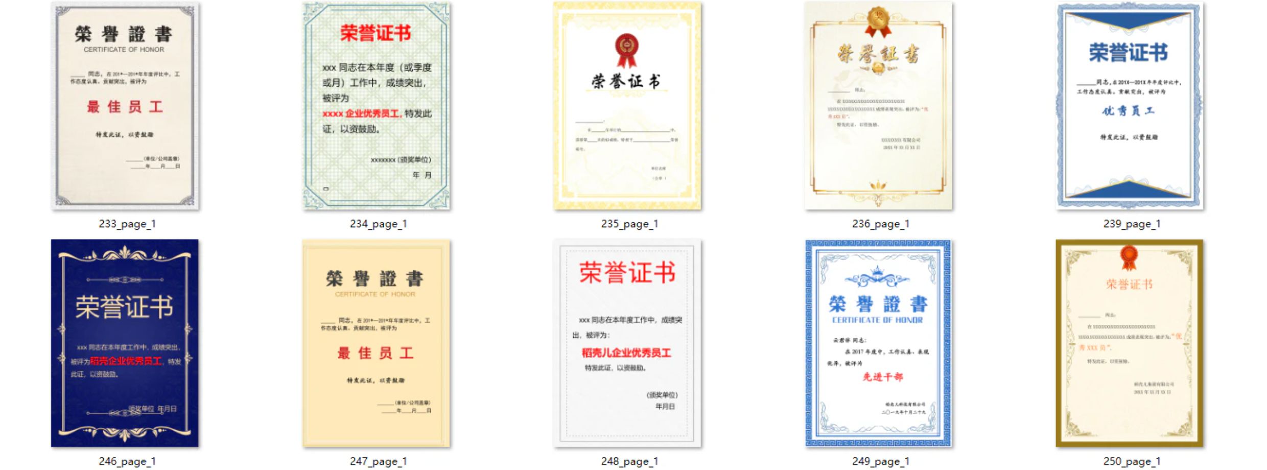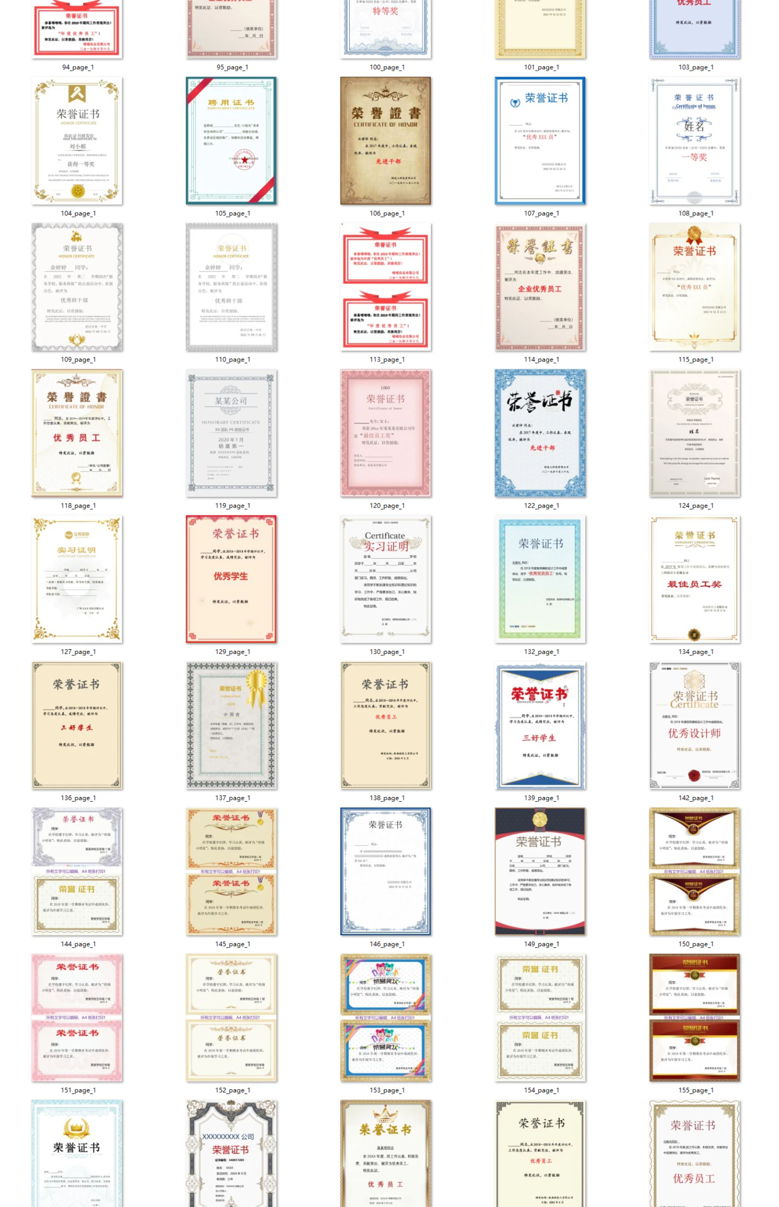 电子版340个可打印横版+竖版WORD可修改内容荣誉证书模板合集